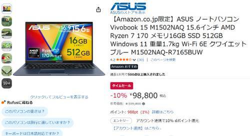 ASUSのノートパソコン「Vivobook 15 M1502NAQ」がAmazonでタイムセール対象。参考価格109,800円のところ、10%オフの98,800円で販売中。