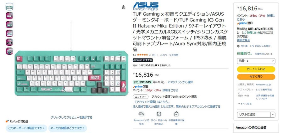 Amazon.co.jpにて、ASUSのゲーミングキーボード「TUF Gaming K3 Gen II Hatsune Miku Edition」が販売中だ。価格は1万6816円。