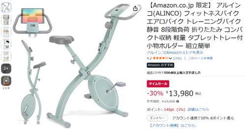 アルインコのフィットネスバイク「AFBX4123」がAmazonでタイムセール対象。参考価格19,900円のところ、30%オフの13,980円で販売中。