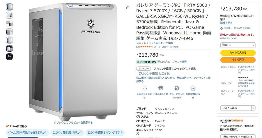 RTX 5060搭載のGALLERIA製ゲーミングデスクトップが21万円台! マイクラとGame Pass1か月版が同梱