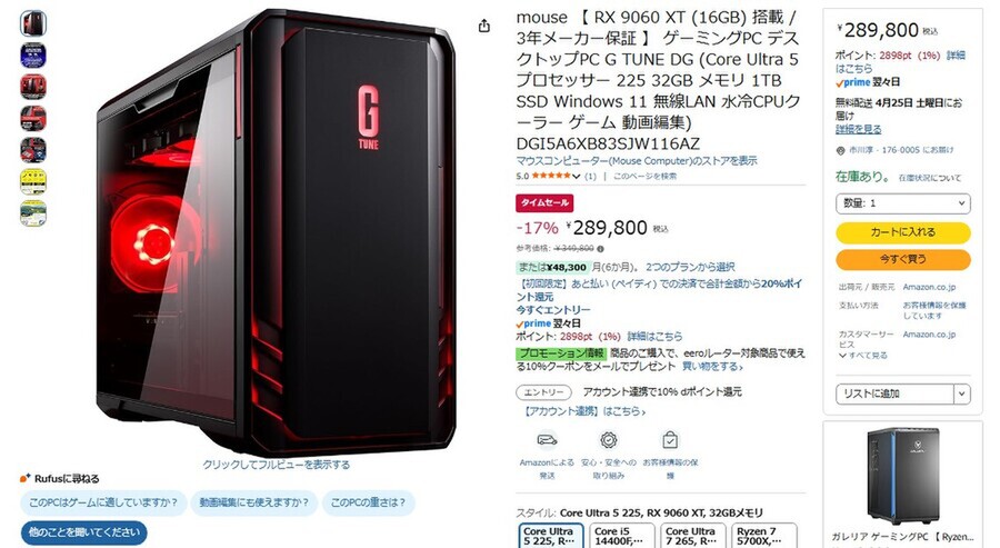 Amazon.co.jpにて、マウスコンピューターのゲーミングデスクトップPC「G TUNE DG(RX 9060 XT搭載)」が販売中だ。参考価格は34万9800円だが、タイムセールにより17%オフの28万9800円で購入できる(4月23日時点)。