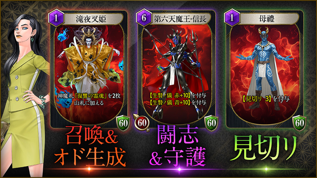 本作には5人のプレイアブルキャラクターが存在し、異なる5つのスタイルでのバトルが楽しめる。プレイヤーはそれぞれの特性を理解し、ランダムに登場するカード(神魔札)を戦略的に選択・強化していくことがダンジョン攻略の鍵となる。