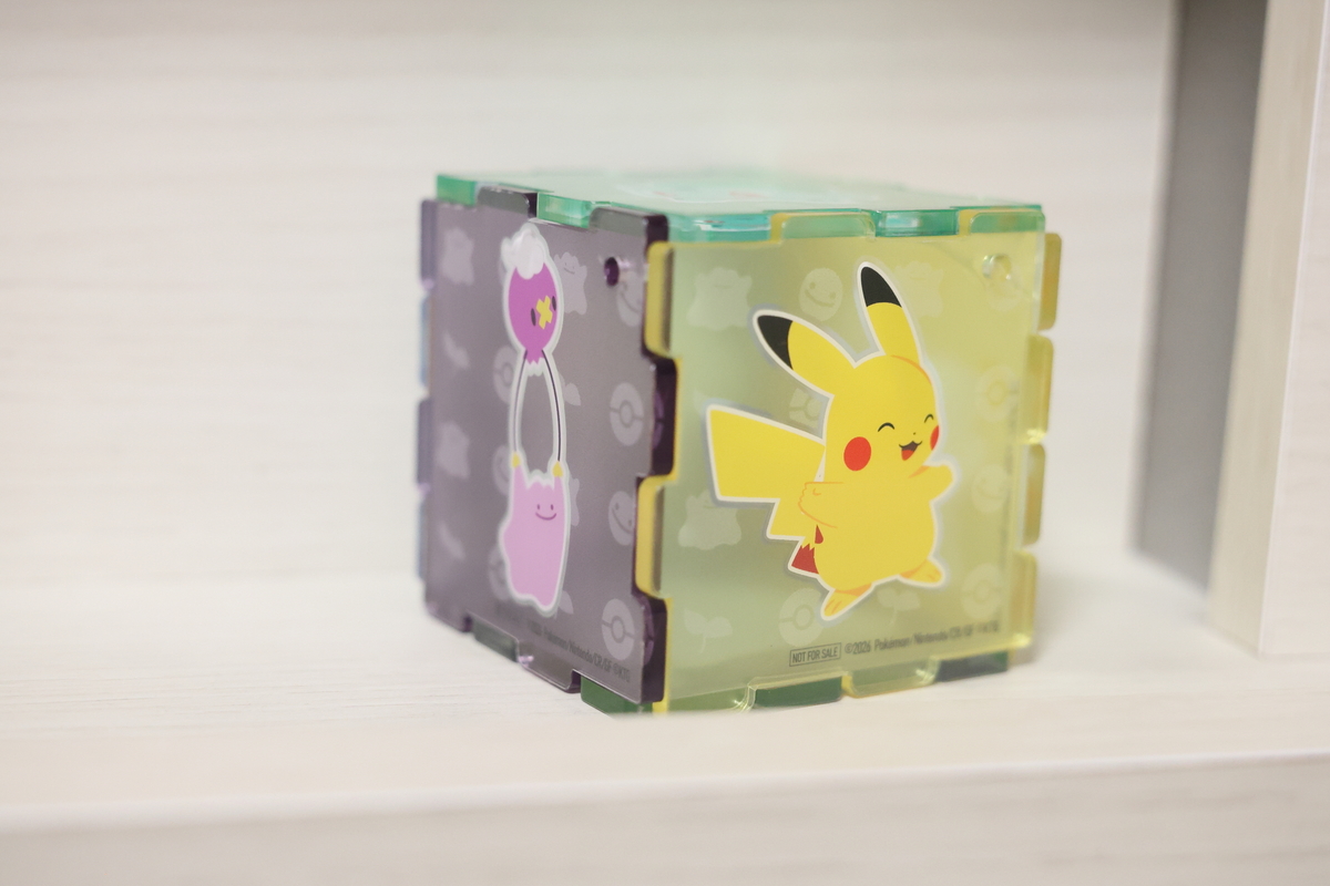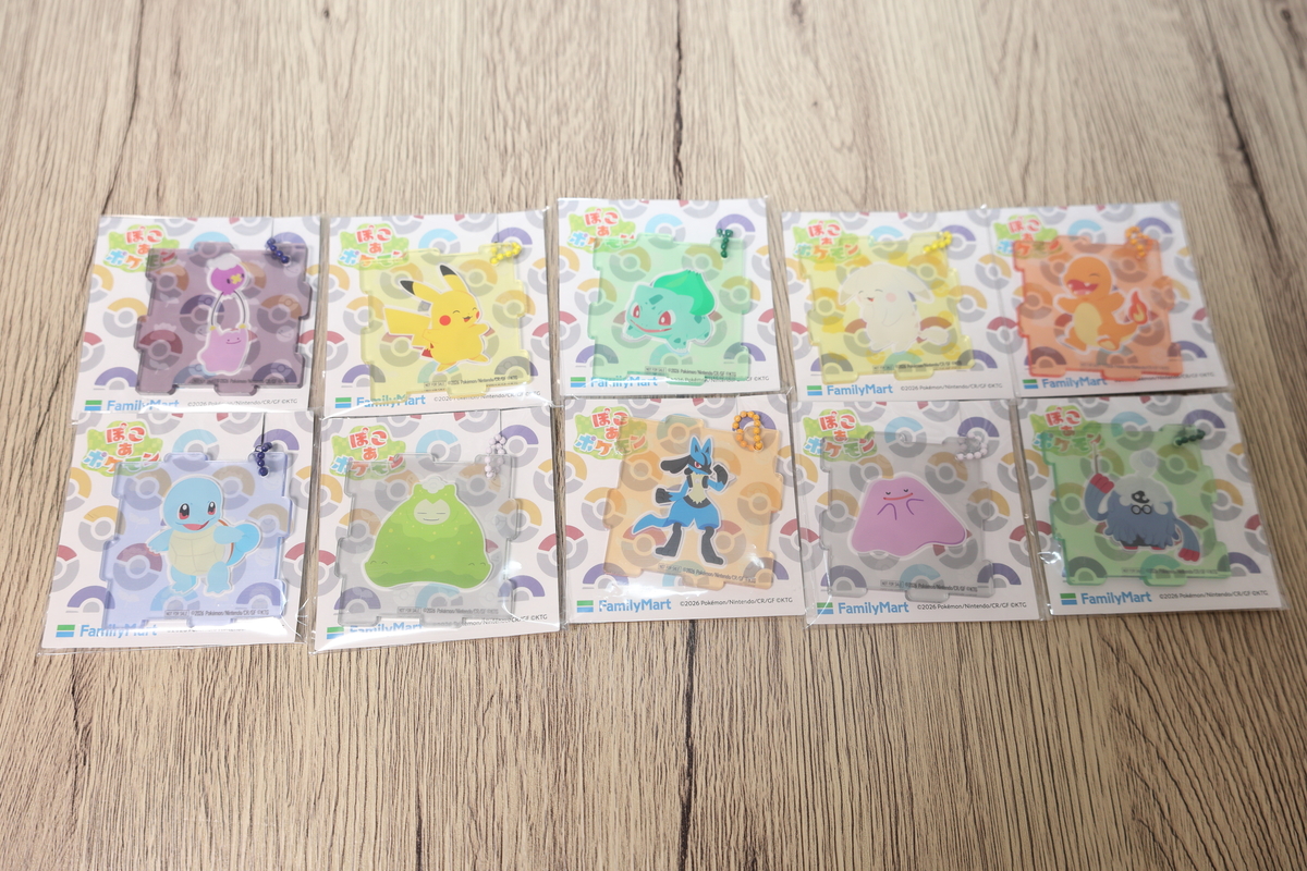 メタモン&フワンテ、ピカチュウ(うすいろ)、カビゴン(こけむし)、ルカリオ、モジャンボ(はかせ)の全5種がデザインされたアクリルパズルキーホルダー。