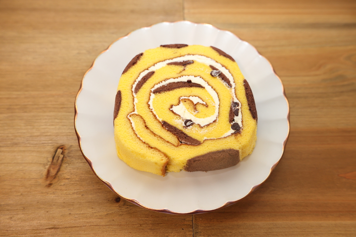 チョコチップ入りのバナナクリームを、ピカチュウをイメージした黄色と茶色のスポンジ生地で巻き上げています。