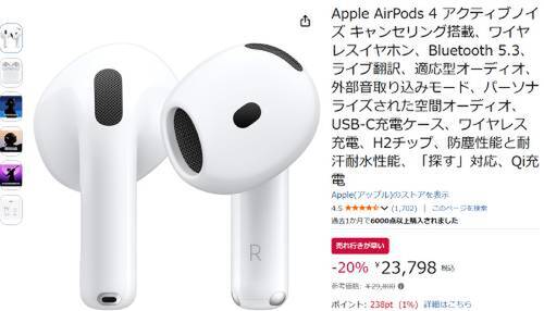 Appleのワイヤレスイヤホン「AirPods 4(アクティブノイズキャンセリング搭載モデル)」がAmazonで割引中。参考価格29,800円のところ、20%オフの23,798円で販売中。