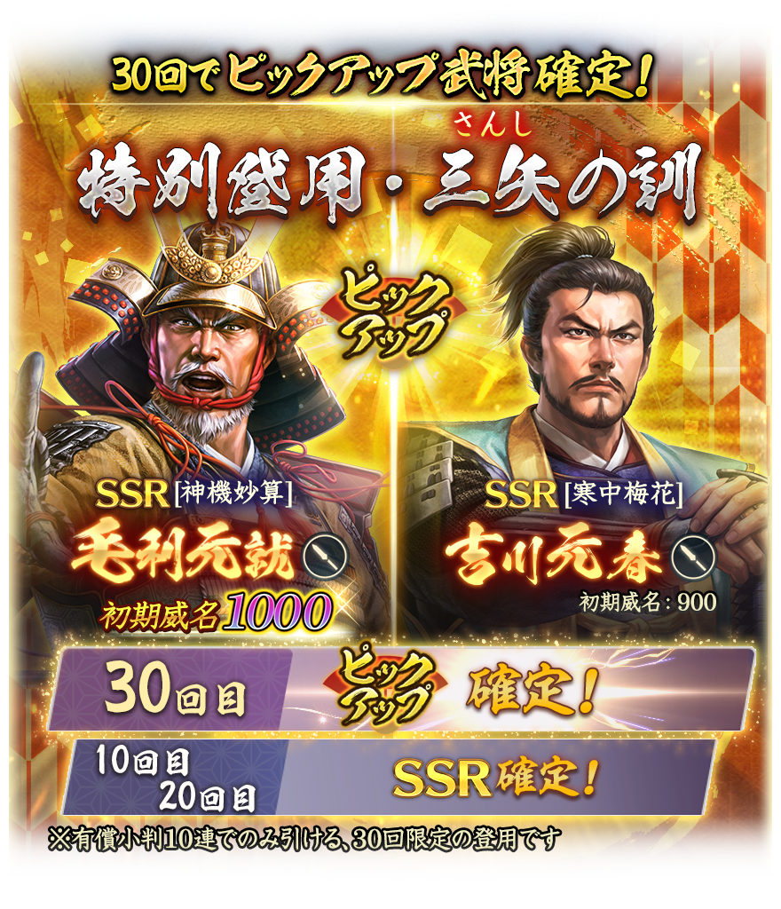 「特別登用・三矢の訓」を開催。SSR【神機妙算】毛利元就、SSR【寒中梅花】吉川元春がピックアップされる。