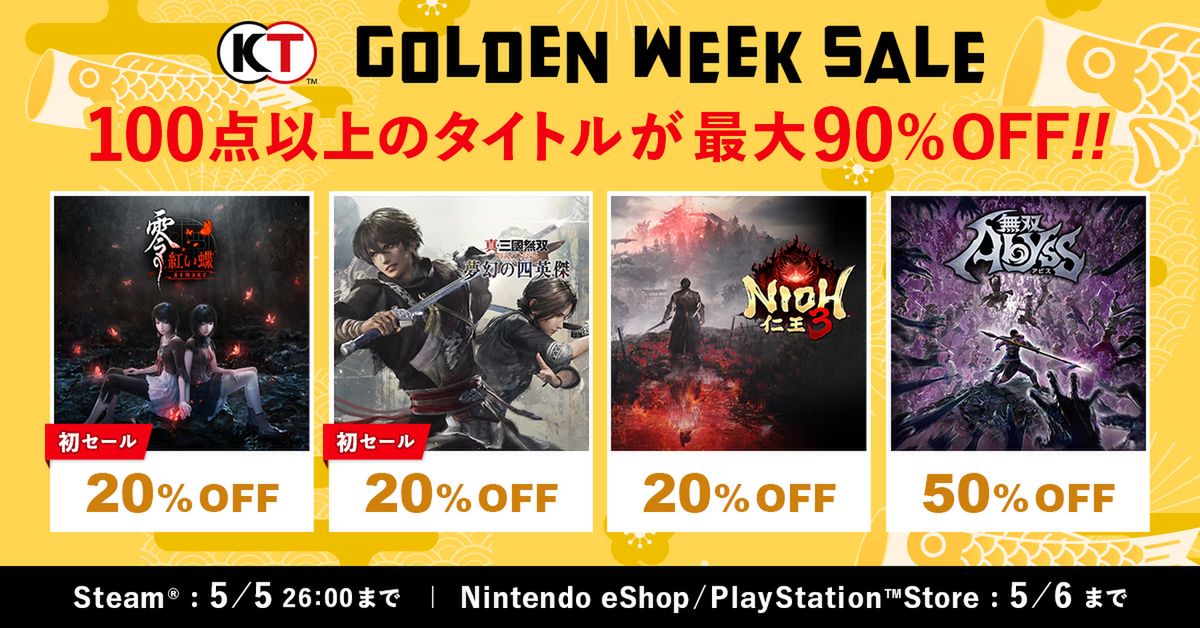 コーエーテクモゲームスは4月24日、Steam/ニンテンドーeショップ/PlayStation Storeで配信中の同社タイトルを、通常価格の最大90%オフで提供するコーエーテクモ「ゴールデンウィークセール」を開催。セール期間は、Steamは2026年5月6日2時まで、ニンテンドーeショップとPlayStation Storeは5月6日23時59分までとなる。