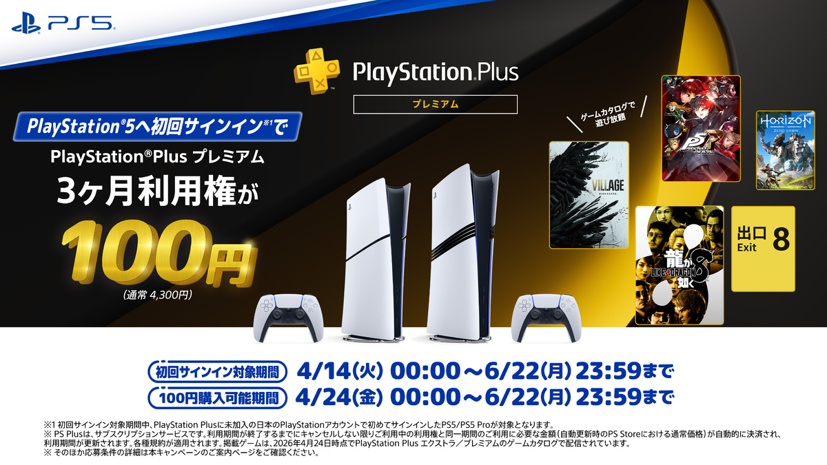 ソニー・インタラクティブエンタテインメントは4月24日、PlayStation 5を初めて買ったユーザーを対象に、「PlayStation Plus プレミアム 3ヶ月利用権」を100円で購入できるキャンペーンを開始した。通常なら4300円なので、非常にお得となる。