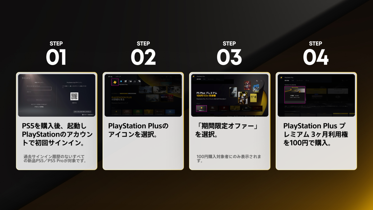 本キャンペーンの対象者は、PS Plusに未加入で、新品のPS5に初めてサインイン(ログイン)した人。すでに加入したことのあるアカウントや、すでにサインイン履歴のあるPS5本体を使用した場合は、キャンペーンの対象外となるので注意しよう。