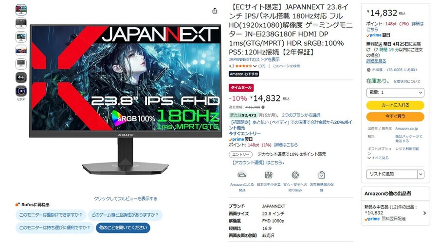 1万5000円切るなら買いでしょ 180Hz・1msのJAPANNEXT製23.8型フルHDゲーミングディスプレーがタイムセールの対象に