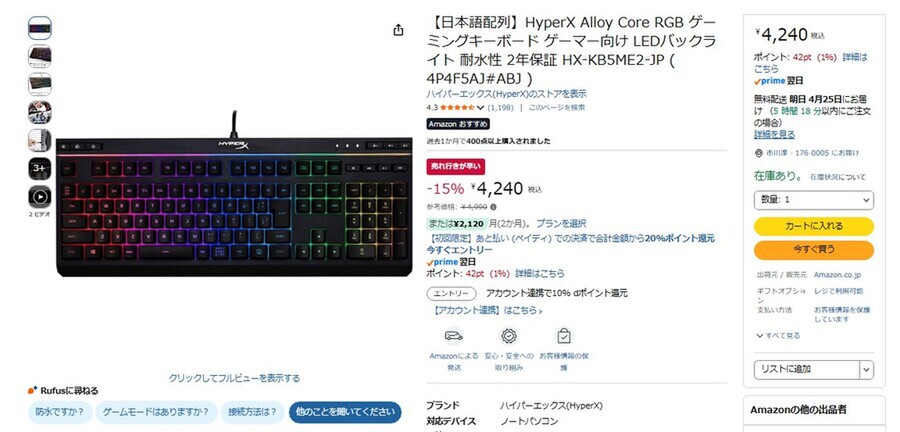 Amazon.co.jpにて、HyperXのゲーミングキーボード「HyperX Alloy Core RGB」が販売中だ。参考価格は4990円だが、執筆時点では15%オフの4240円で購入できる(4月24日時点)。