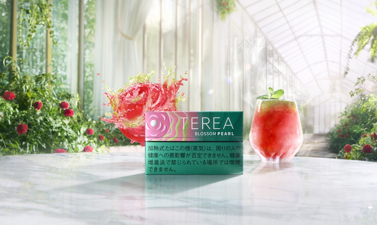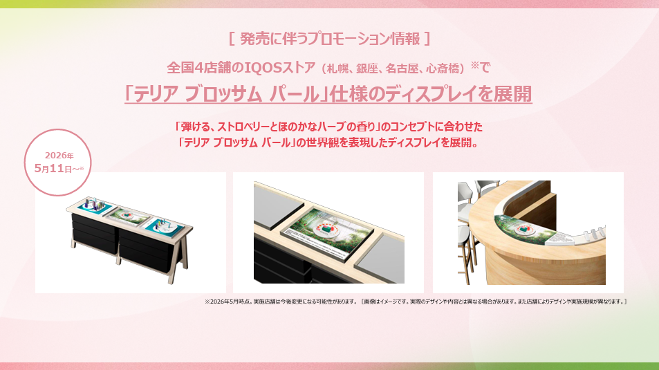 また、テリア ブロッサム パールの発売に伴うプロモーションとして、全国4店舗のIQOSストア(札幌、銀座、名古屋、心斎橋)でテリア ブロッサム パール仕様のディスプレイを展開。「弾ける、ストロベリーとほのかなハーブの香り」のコンセプトの世界観を表現したディスプレイになるという。