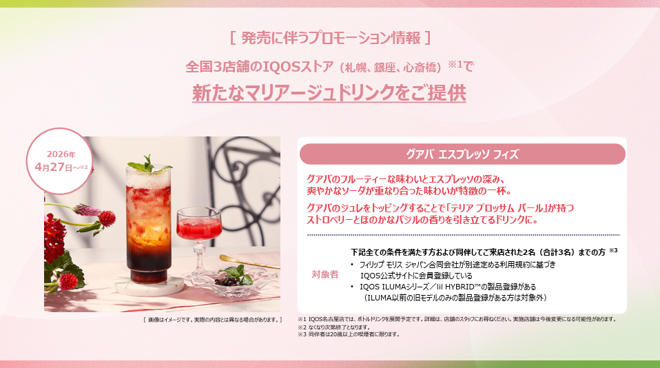 加えて、全国3店舗(札幌、銀座、心斎橋)では、新たなマリアージュドリンク「グアバ エスプレッソ フィズ」を、条件を満たす人および同伴して来店した2名(合計3名)に提供する。対象者は、同社が別途定める利用規約に基づき、IQOS公式サイトに会員登録をしているかつ、IQOS ILUMAシリーズ/lil HUBRIDの製品登録がある人となる。