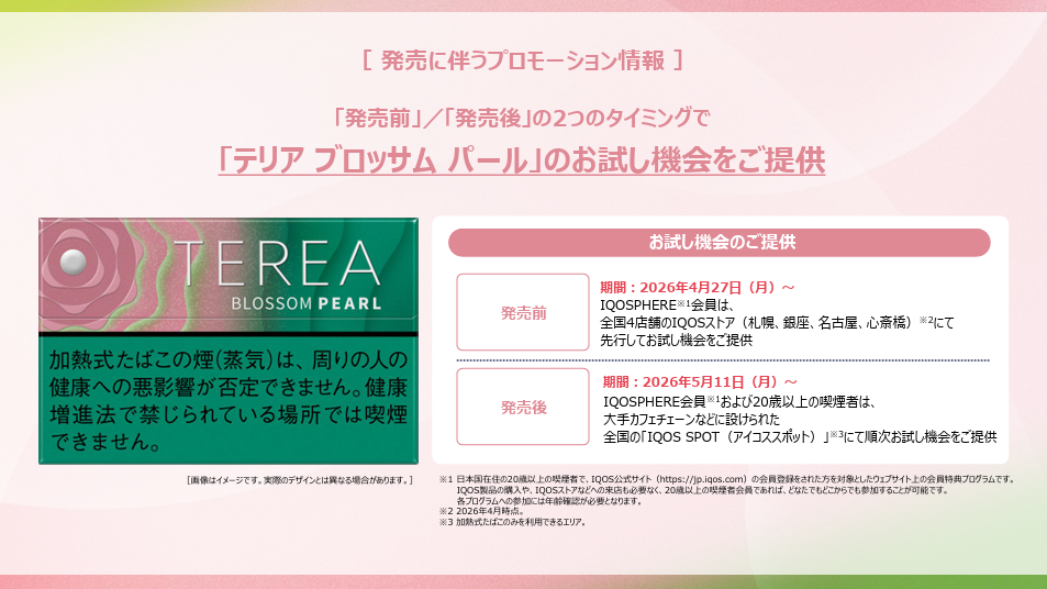 4月27日からはIQOSPHERE会員を対象に、全国4店舗のIQOSストア(札幌、銀座、名古屋、心斎橋)で、テリア ブロッサム パールを先行で試せる機会を提供。また、5月11日からは、大手カフェチェーンなどに設けられた全国のIQOS SPOTで順次お試し機会を提供するとのことだ。