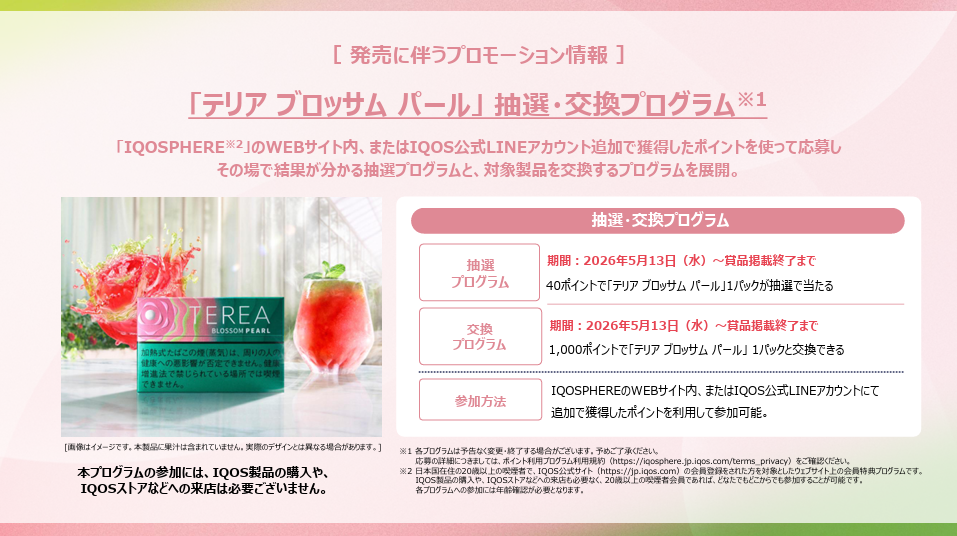 そのほか、IQOSPHEREのWEBサイト内、IQOS公式LINEアカウント追加で獲得したポイントを使ったテリア ブロッサム パールの抽選・交換プログラムも実施。抽選プログラムは5月13日から40ポイントで抽選、交換プログラムは5月13日から1000ポイントで交換可能だ。