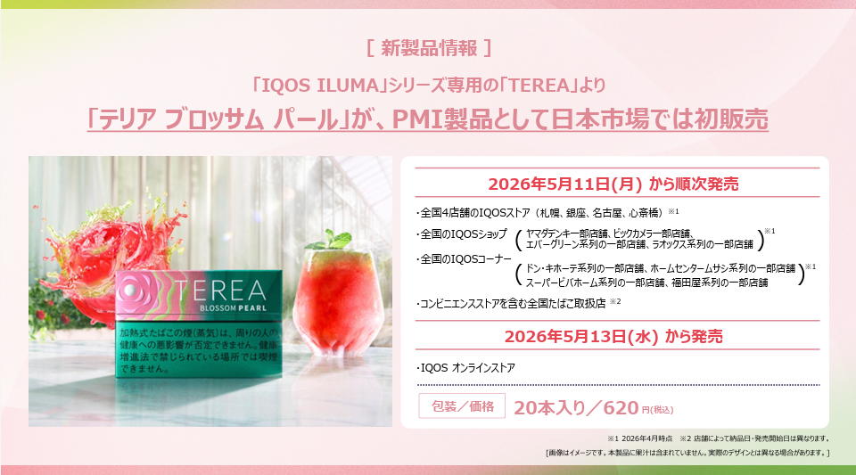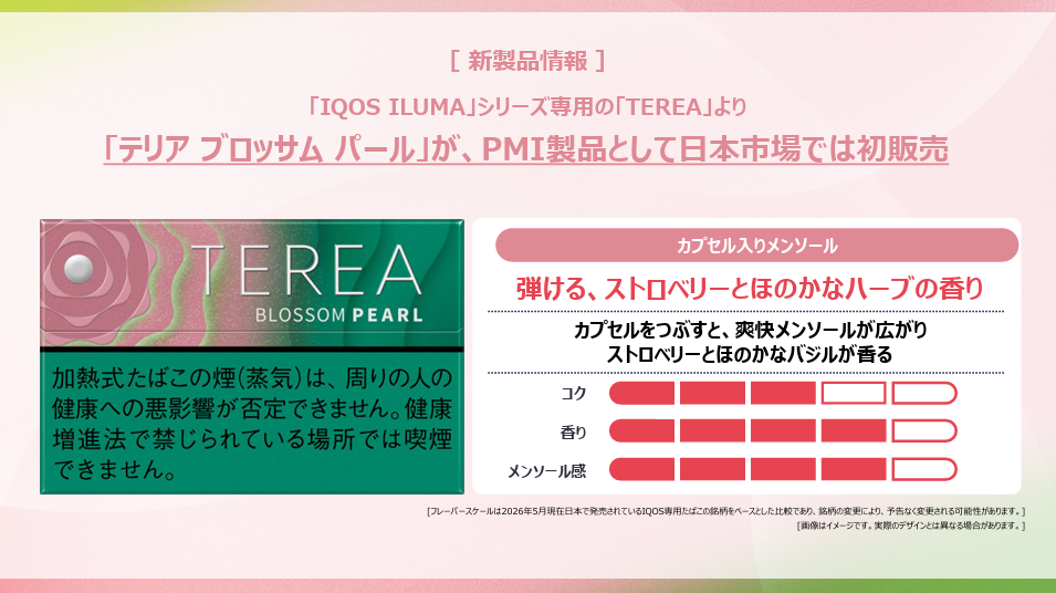 フィリップ モリス ジャパンは4月27日、加熱式たばこ「IQOS ILUMA」シリーズ専用たばこスティック「TEREA」の新銘柄として「テリア ブロッサム パール」を発表した。