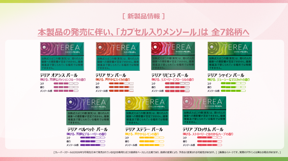 テリア ブロッサム パールは、TEREAのカプセル入りメンソールの新銘柄で、カプセル入りメンソールは全7銘柄になった。