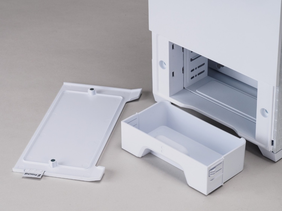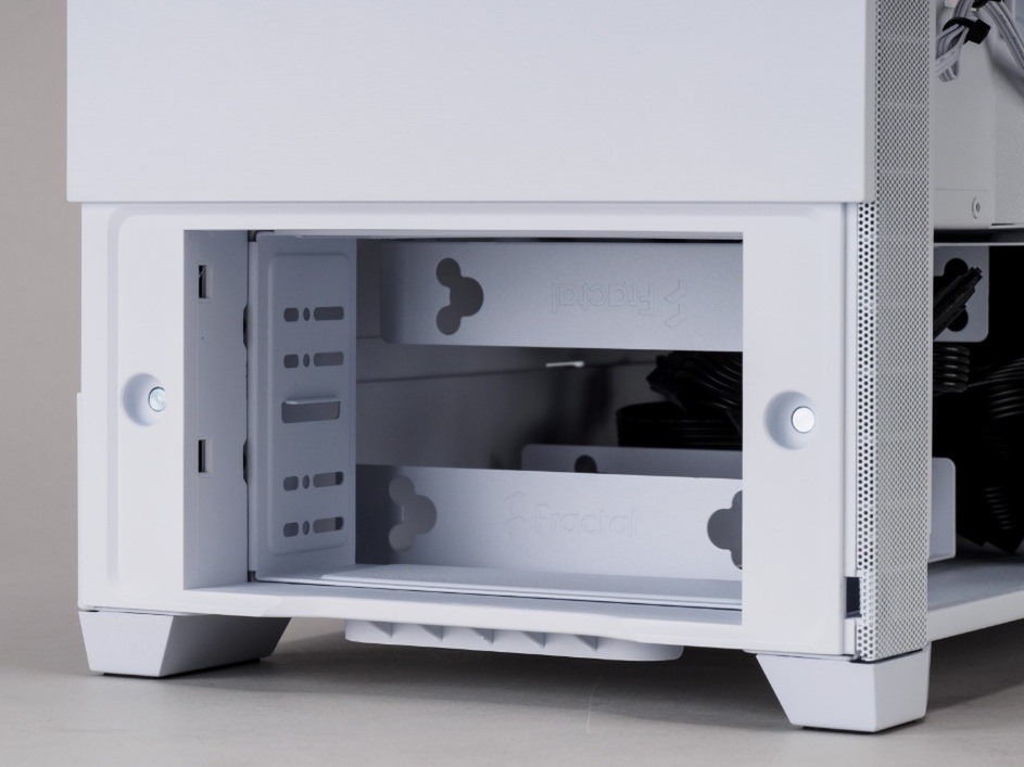 Fractal Designの「Pop Silent」がユニークな点は、前面下部に小物入れを装備していること。小物入れなんて必要ないと思うかもしれないが、PCと関わりの深いもの、たとえばOS再インストール用のUSBメモリー、カードリーダー、USBの変換コネクター、サポートの連絡先メモといったものを入れておくのに最適だ。