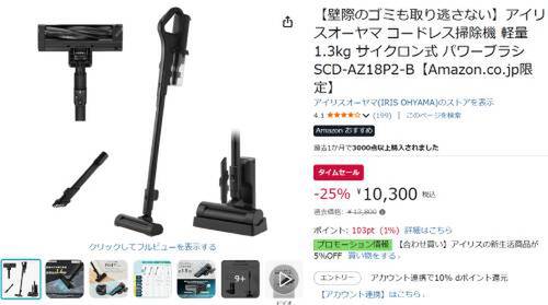 アイリスオーヤマのコードレス掃除機「SCD-AZ18P2-B」がAmazonでタイムセール対象。参考価格13,800円のところ、25%オフの10,300円で販売中。