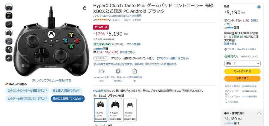 Amazon.co.jpにて、HyperXのXboxコントローラー「HyperX Clutch Tanto Mini」が販売中だ。参考価格は5900円だが、タイムセールにより12%オフの5190円で購入できる。