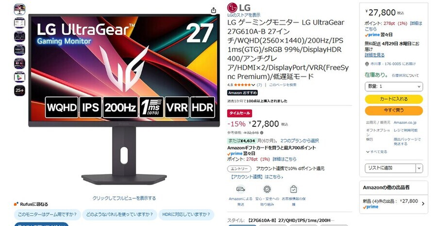 Amazon.co.jpにて、LGの27型WQHDゲーミングディスプレー「LG UltraGear 27G610A-B」が販売中だ。参考価格は3万2545円だが、タイムセールにより15%オフの2万7800円で購入できる(4月27日時点)。