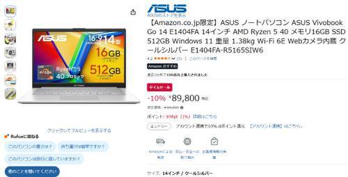 ASUSのノートパソコン「ASUS Vivobook Go 14 E1404FA(E1404FA-R5165SIW6)」がAmazonでタイムセール対象。参考価格99,800円のところ、10%オフの89,800円で販売中。