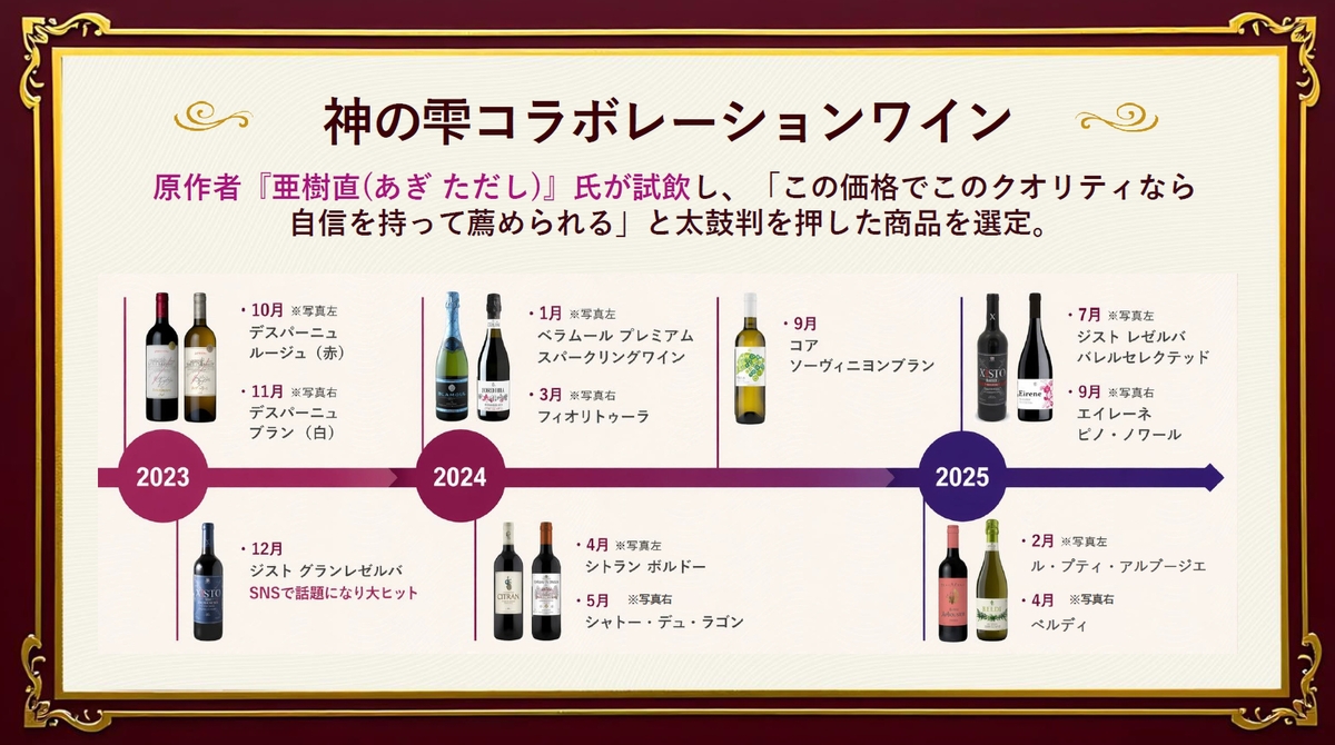 「神の雫」とのコラボは、2023年にスタート。原作者の亜樹直氏(樹林ゆう子氏、樹林伸氏)が試飲し、「この価格でこのクオリティなら自信をもってすすめられる」と太鼓判を押した商品を選定していることが特徴です。
