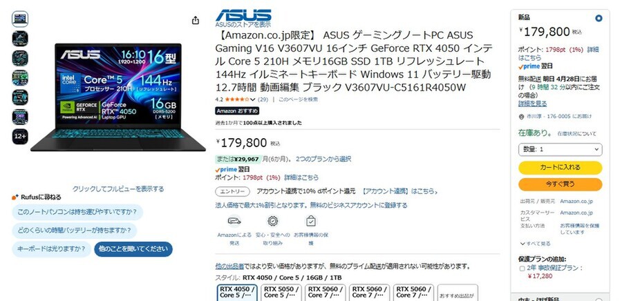 Amazon.co.jpにて、ASUSの16型ゲーミングノートPC「ASUS Gaming V16 V3607VU」が販売中だ。価格は17万9800円。