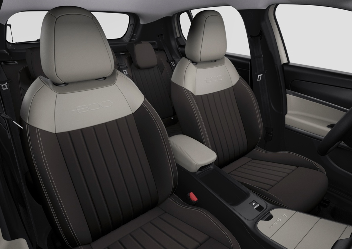 「600 Hybrid La Prima Caffelatte」の特別装備は、グラファイト/アイボリーのツートーンエコレザーシート、ホワイトパッケージ、ホワイトのドアミラーカバー、ホワイトのフロント600エンブレム、ホワイトのリアFIATエンブレムなど。