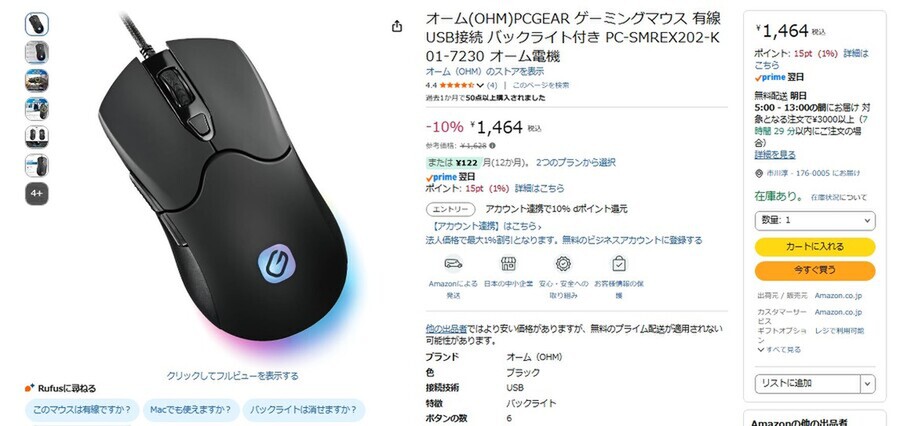 ゲームプレイに必要なものが一通りそろったコスパゲーミングマウス、10%オフの1464円で買えるぞ