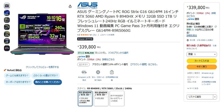 Amazon.co.jpにて、ASUSの16型ゲーミングノートPC「ROG Strix G16 G614PM」が販売中だ。価格は33万9800円。