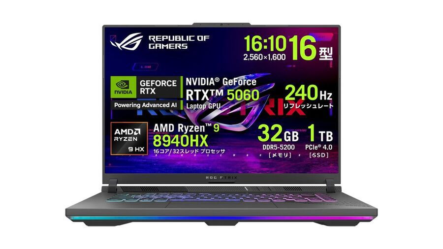 本製品は、AMD「Ryzen 9 8940HX」とNVIDIA「GeForce RTX 5060 Laptop GPU」を搭載するゲーミングノートPC。メモリーは32GB(DDR5-5200)、ストレージは1TB M.2 SSD、解像度は2560×1600ドット、リフレッシュレートは240Hz、OSはWindows 11 Homeなど。