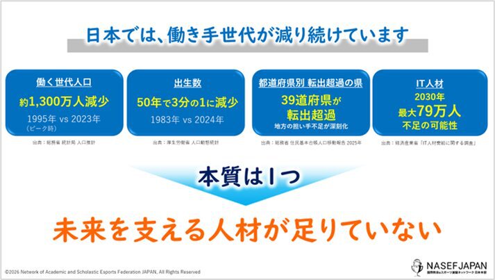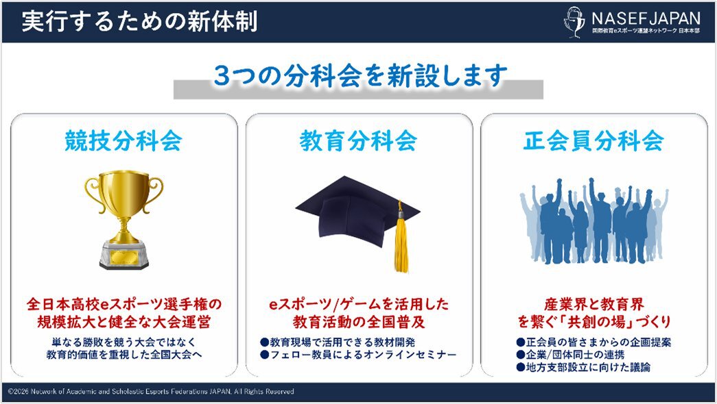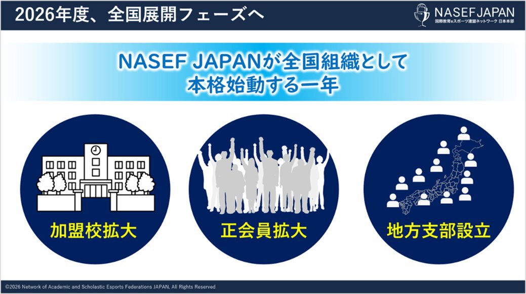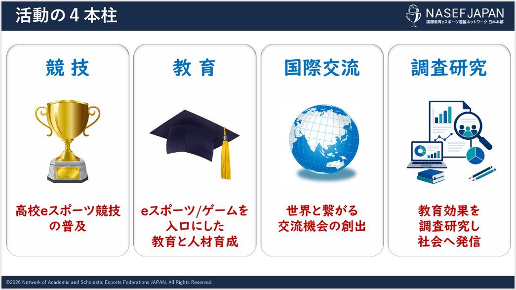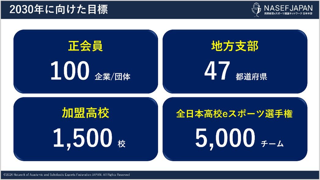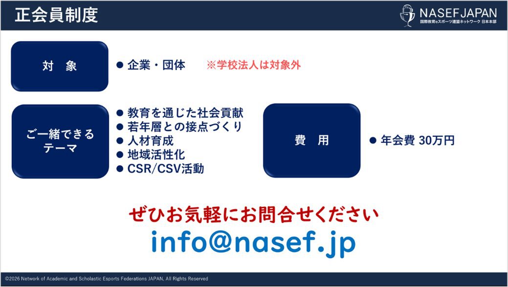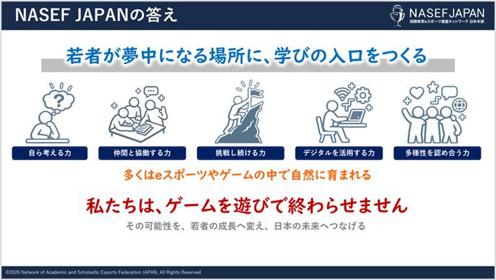 「日本は今、多くの社会課題に直面しています。しかし、その本質は「未来を支える人材をどう育てるか」にあります。eスポーツやゲームには、若者が夢中になりながら学び、仲間と協働し、自ら考え挑戦する力を育む可能性があります。NASEF JAPANは、その可能性を社会の力へと変えるべく先頭に立って進んでいきます。」