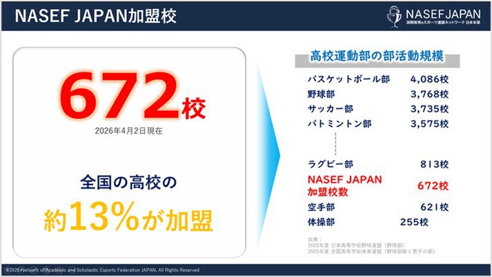 NASEF JAPANの加盟校は現在670校を突破。この数字は全国の高校の約13%にあたり、高校部活動規模と比較すると、空手部よりも多くラグビー部に迫る規模へと広がっていると説明。