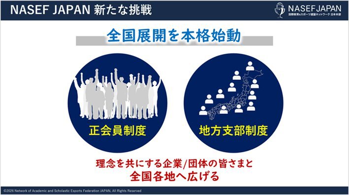 日本全国には5000校を超える高校があり、1700を超える市町村がある。まだ、多くの地域・学校・若者に「学びと挑戦」の機会が十分に届いていない現状を踏まえ、これまでNASEF JAPANが行ってきた「eスポーツやゲームを入口とした人材育成活動」を全国に広げていくために「正会員制度の開始」と「地方支部制度の始動」を宣言した。