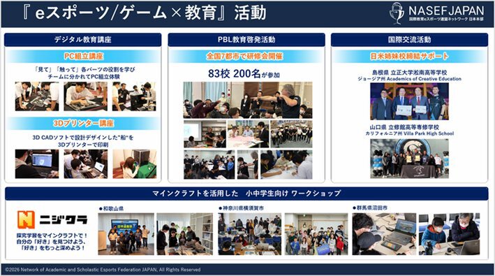 現在、全国670校超が加盟する高校ネットワークを基盤に、eスポーツやゲームを入口とした次世代人材育成をさらに広げ、少子化、DX人材不足、地方の若者流出、教育現場における多様な学びへの対応など、日本が抱える複合的な課題に対し、若者育成を通じて挑戦していく考えを示した。