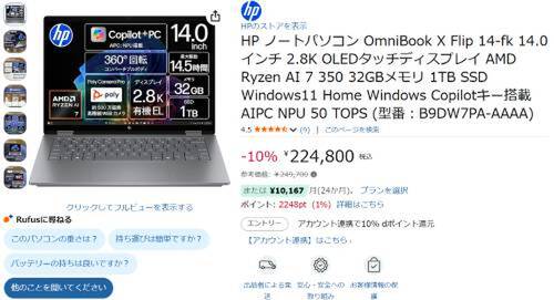 HPのノートパソコン「OmniBook X Flip 14-fk(B9DW7PA-AAAA)」がAmazonで割引対象。参考価格249,700円のところ、10%オフの224,800円で販売中。
