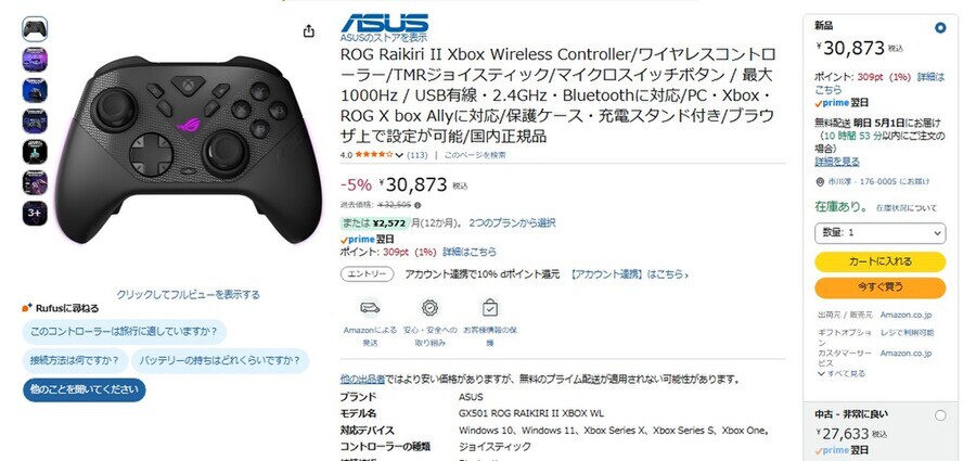 Amazon.co.jpにて、ASUSの「ROG Raikiri II Xbox Wireless Controller」が販売中だ。過去価格は3万2505円だが、執筆時点では5%オフの3万873円で購入できる(4月30日時点)。