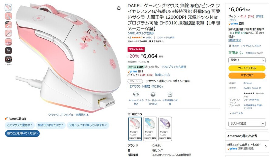 Amazon.co.jpにて、DAREUのワイヤレスゲーミングマウス「EM901X(桜色/ピンク)」が販売中だ。過去価格は7580円だが、スマイルSALEにより20%オフの6064円で購入できる(4月30日時点)。