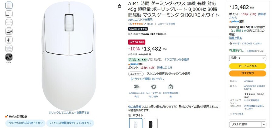 Amazon.co.jpにて、AIM1のワイヤレスゲーミングマウス「SHIGURE ホワイト」が販売中だ。参考価格は1万4980円だが、スマイルSALEにより10%オフの1万3482円で購入できる(4月30日時点)。
